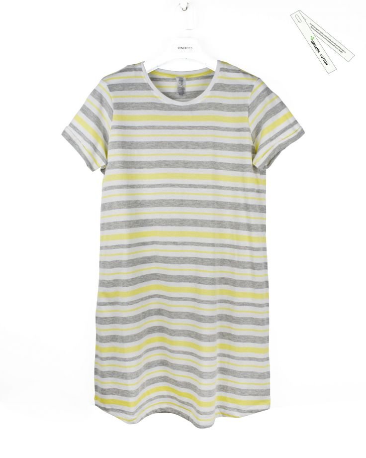 | TRIM WHEIGHT | FABRICATION | S/Jersey | FABRIC CODE | FABRIC COLOR | Yellow/White Y/D | FABRIC WEIGHT | 160 | FABRIC COMPOSITION | 97% Organic Cotton, 3% Viscose |