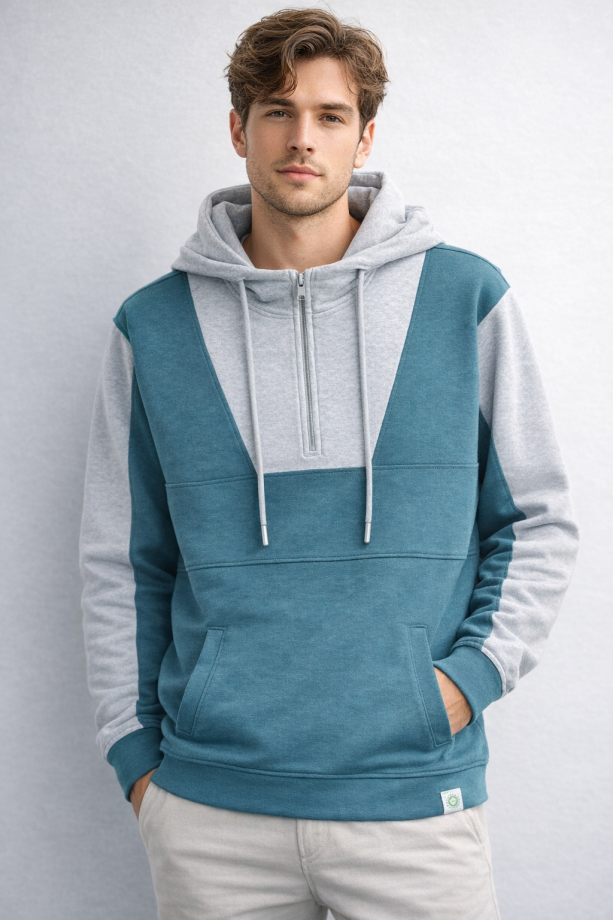 | TRIM WHEIGHT | FABRICATION | TERRY | FABRIC CODE | FABRIC COLOR | GRAY/TEAL GREEN | FABRIC WEIGHT | 230 GSM | FABRIC COMPOSITION | 70% RECYCLE COTTON 30% POLYESTER |