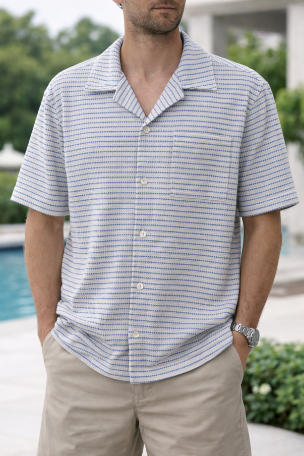 | TRIM WHEIGHT | FABRICATION | JACQUARD Y/D | FABRIC CODE | FABRIC COLOR | LIGHT BLUE/WHITE | FABRIC WEIGHT | 215 GSM | FABRIC COMPOSITION | 56%COTTON,40%POLYESTER,4%SPA |